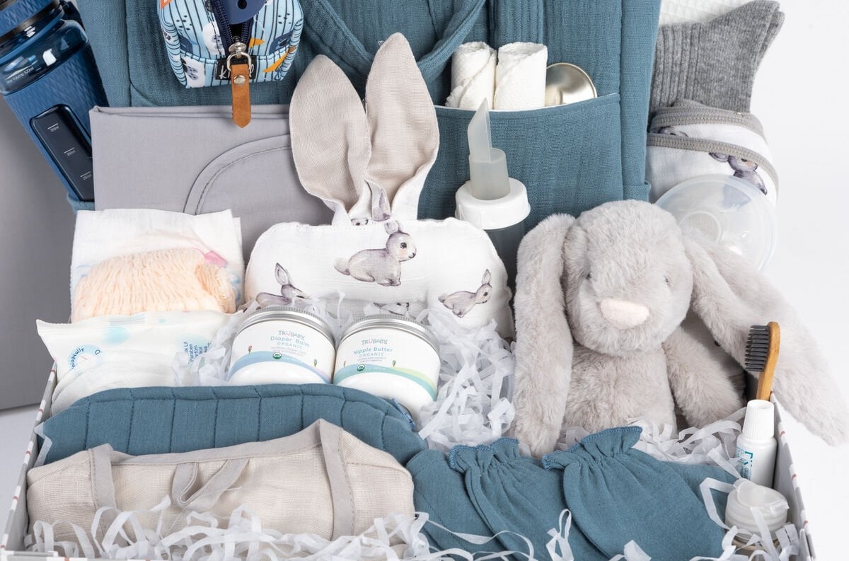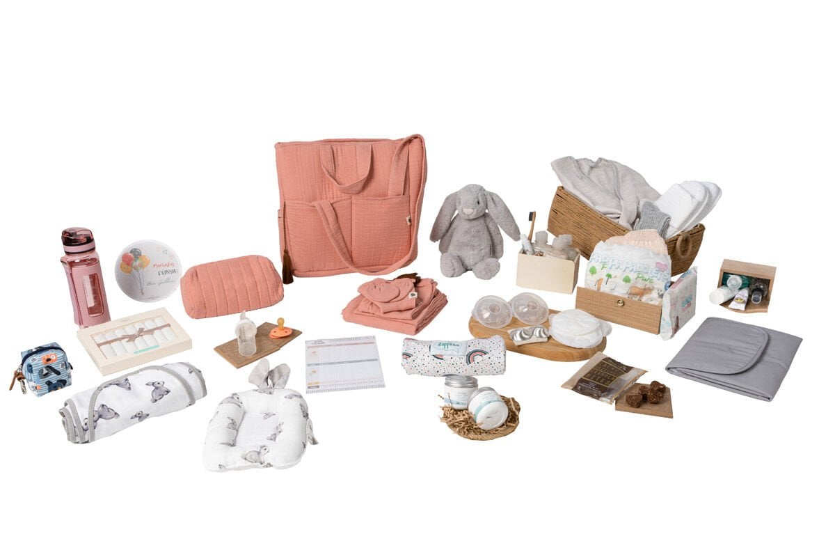 Hastane Çantası Bebek ürünleri: Ağız Bezi, Emzik, Süt Kaşığı, Bebek bezi, Islak Mendil, "Merhaba Dünya" Kartı, Yenidoğan Hastane Çıkışı, Pişik Kremi, Hazır Kundak, Emzirme Yastığı, Uyku Arkadaşı