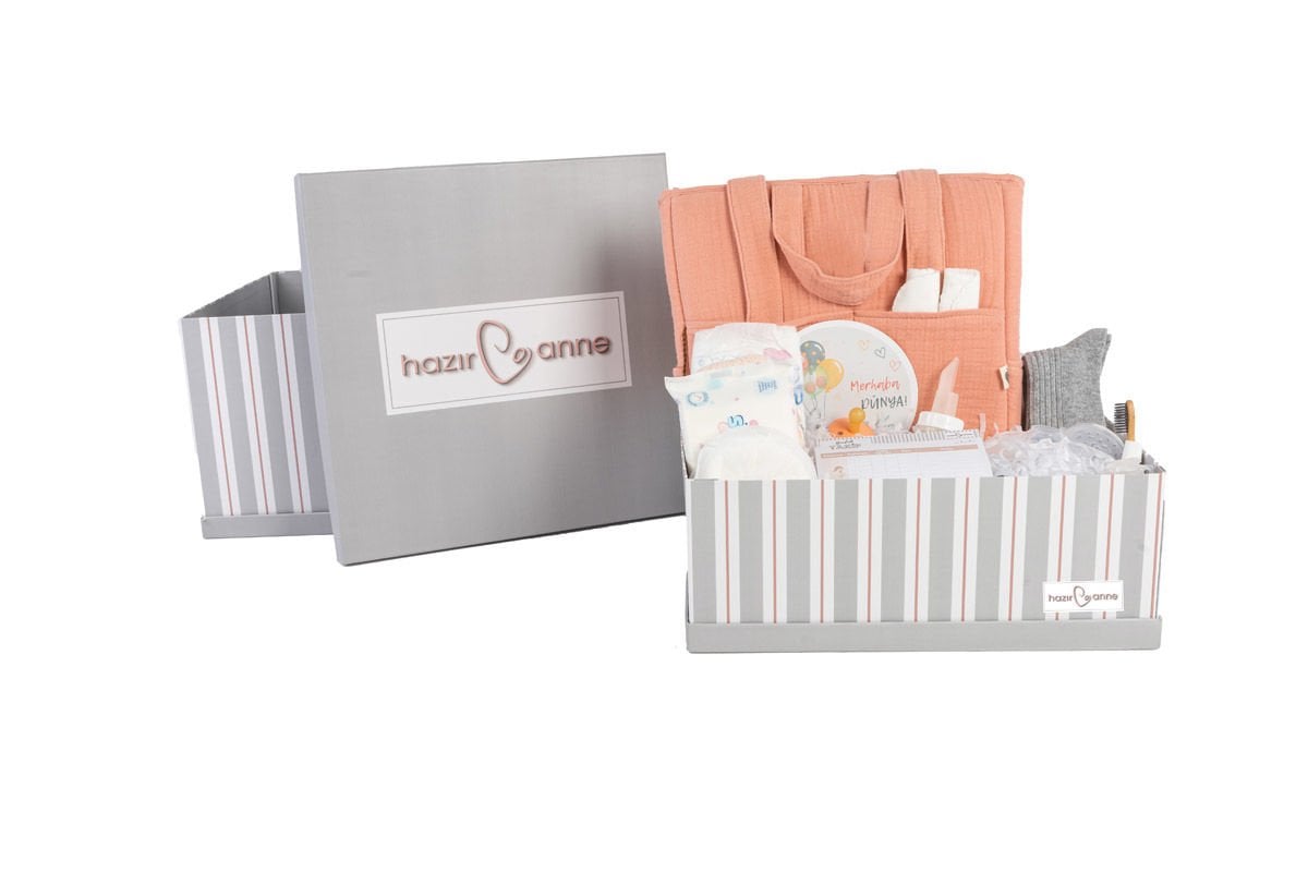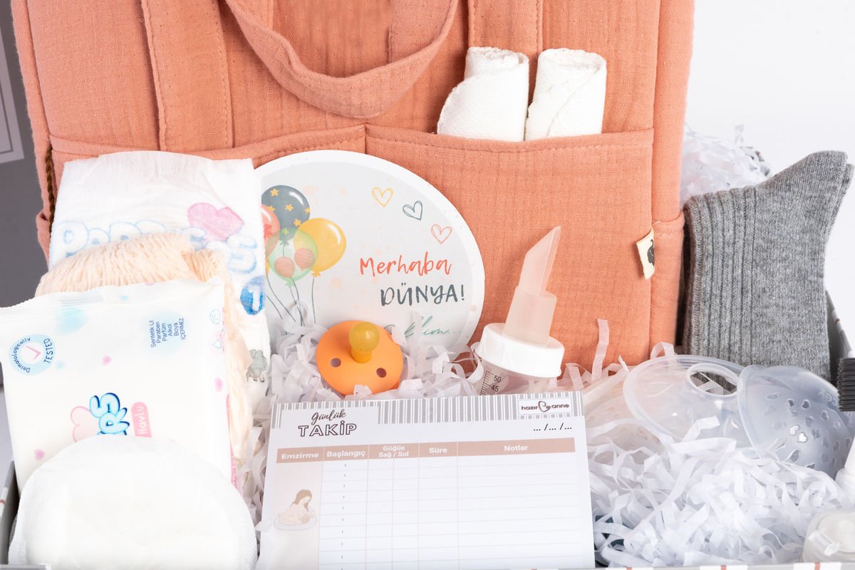 Hastane Çantası Bebek ürünleri: Ağız Bezi, Emzik, Süt Kaşığı, Bebek bezi, Islak Mendil, "Merhaba Dünya" Kartı, Yenidoğan Hastane Çıkışı, Pişik Kremi, Hazır Kundak, Emzirme Yastığı, Uyku Arkadaşı